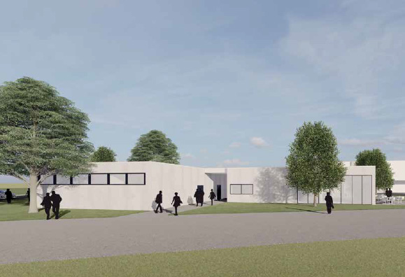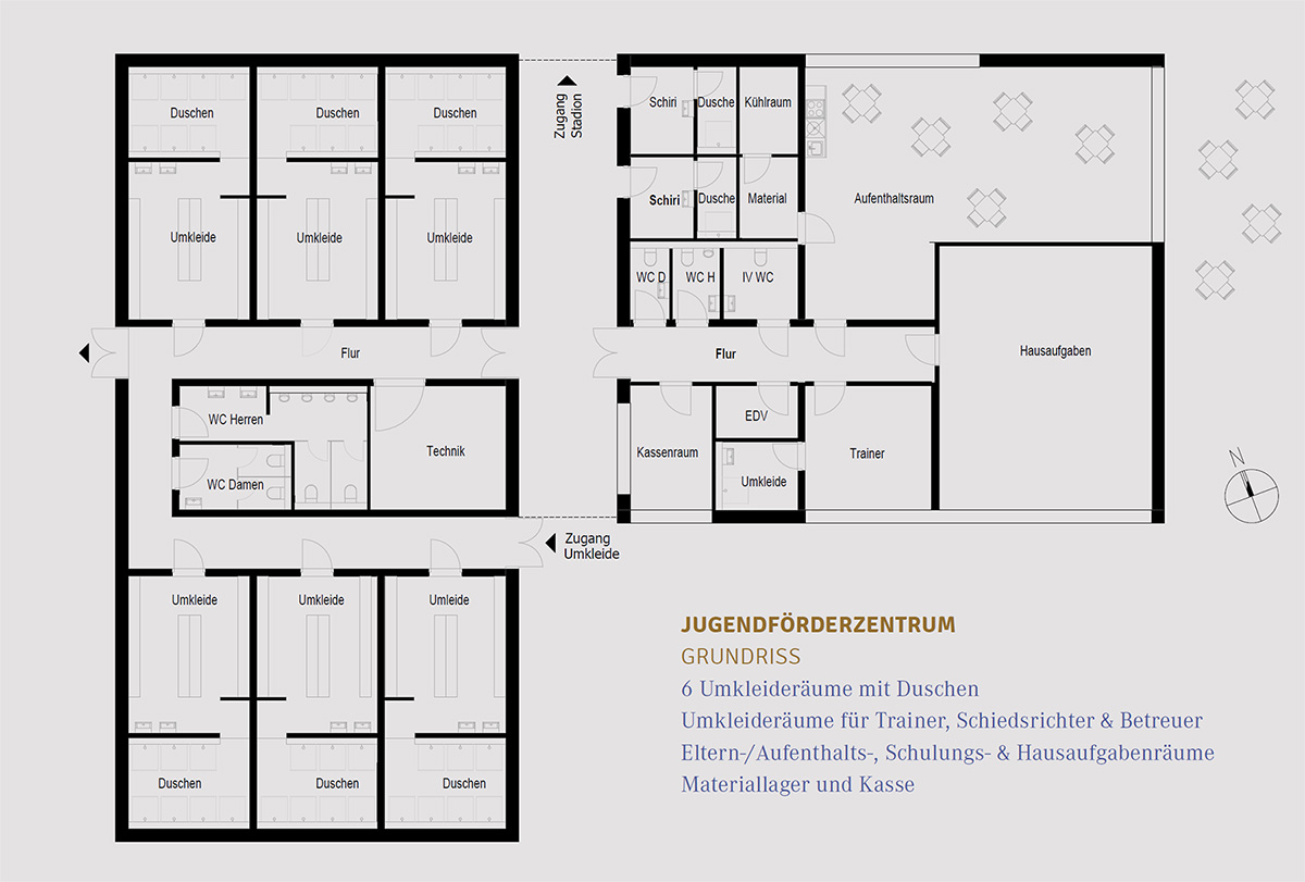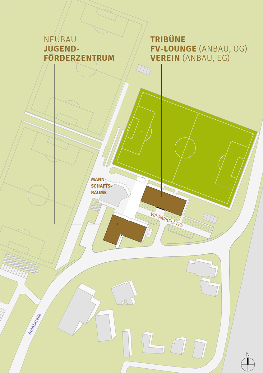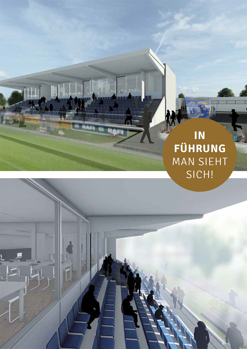 Hinter der Tribüne entsteht ein Anbau mit komfortabler Lounge im Obergeschoss. Darunter richten wir maßgeschneiderte Vereinsräume ein. Gegenüber bekommt die Jugend ein modernes Förderzentrum. Dessen Durchgang wird künftig zugleich unser Entrée fürs Stadion sein.